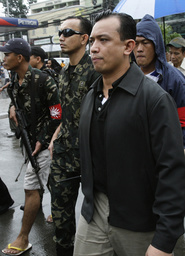 Senator Antonio Trillanes (R) walks from a court to a luxury hotel in Makati City, Manila November 29, 2007. Philippine military and police teams stormed a luxury hotel in Manila on Thursday to end a short-lived coup attempt by a small group of soldiers and others who had called on the army to mutiny. Government forces fired teargas into the lobby of the Manila Peninsula Hotel and used an armoured personnel carrier (APC) to batter down its glass doors before storming in under cover of repeated bursts of fire in the air. REUTERS/John Javellana (PHILIPPINES)